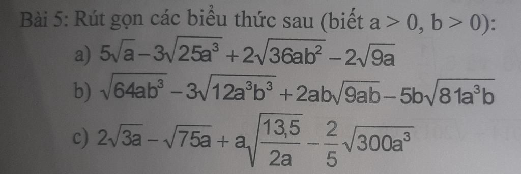 `2\sqrt{3a}-\sqrt{75a}+a.\sqrt{\frac{13,5}{2a}}-2/5\sqrt{300a^{3}}` `(a>0;b>0)`