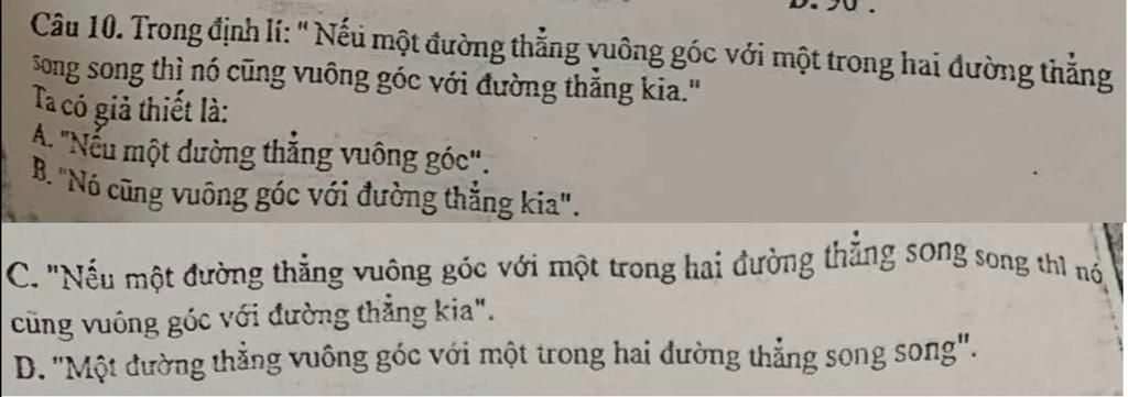 `D.` "Nếu một đường thẳng vuông góc với một trong hai đường thẳng song song"