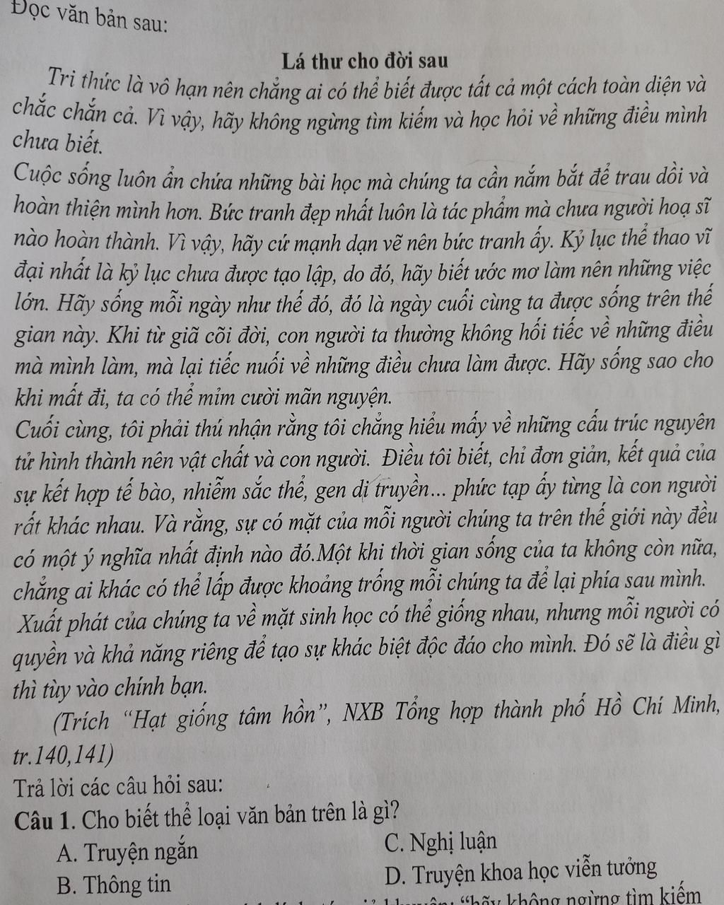 `-` Vì văn bản trên đã bàn về vai trò, ý nghĩa của tri thức . Qua đó, tác giả mong muốn mỗi chúng ta cần luôn trau dồi tri thức, sống hết mình, tích cực làm những điều mà mình muốn, can đảm thực hiện ước mơ để có thể không nuối tiếc khi từ giã cõi đời . Đồng thời, tác giả nhằm muốn nhắn nhủ với mỗi chúng ta rằng ai cũng có những nét độc đáo riêng của bản thân, hãy tự tin sống tốt với những nét riêng biệt ấy vì mỗi nét riêng sẽ tạo nên vẻ đẹp riêng của mỗi người .