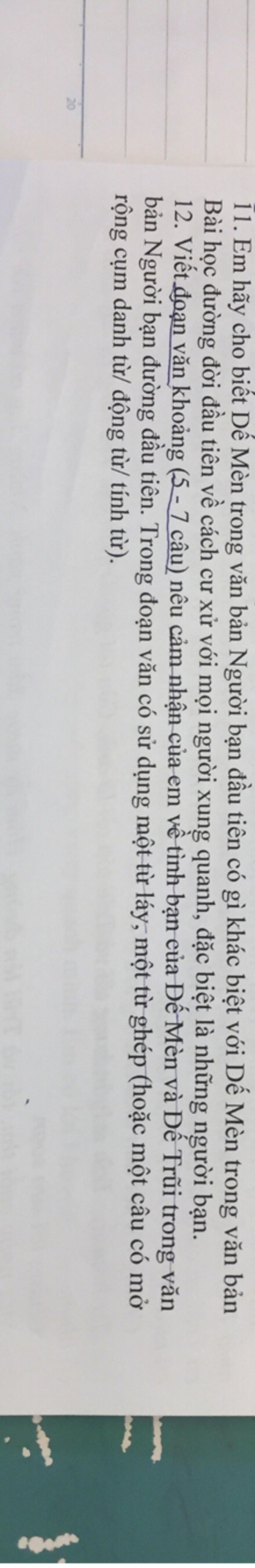 (?) Viết đoạn văn nêu cảm nhận của em về tình bạn của Dế Mèn và Đế Trũi trong văn bản Người bạn đường đầu tiên. Trong đoạn văn có sử dụng một từ láy, một từ ghép (hoặc một câu có mở rộng cụm danh từ/ động từ/ tính từ).