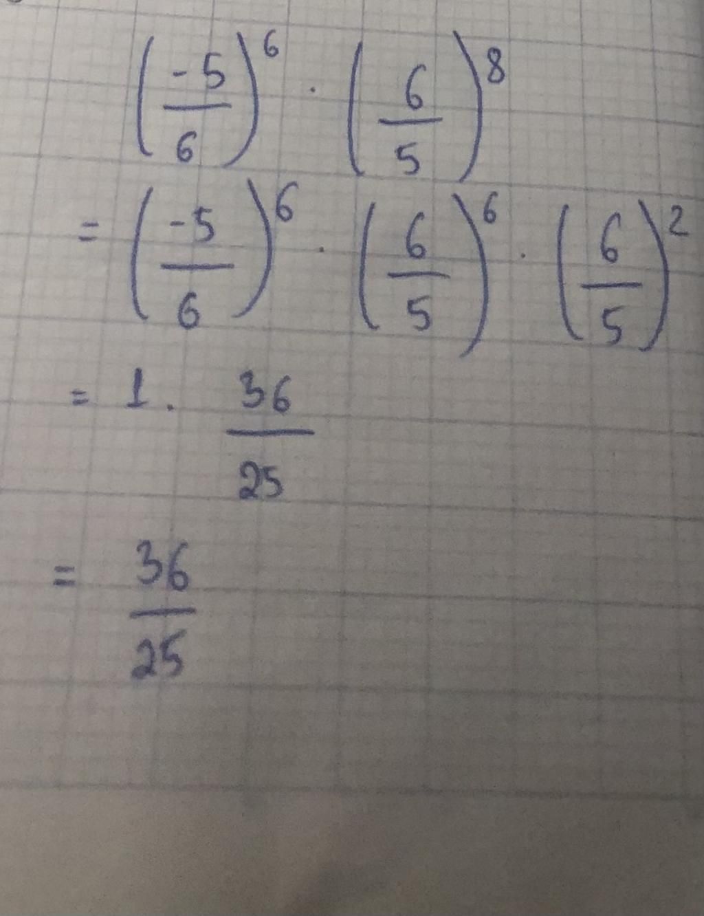 `(-5/6)^{6}xx(6/5)^{8}`
