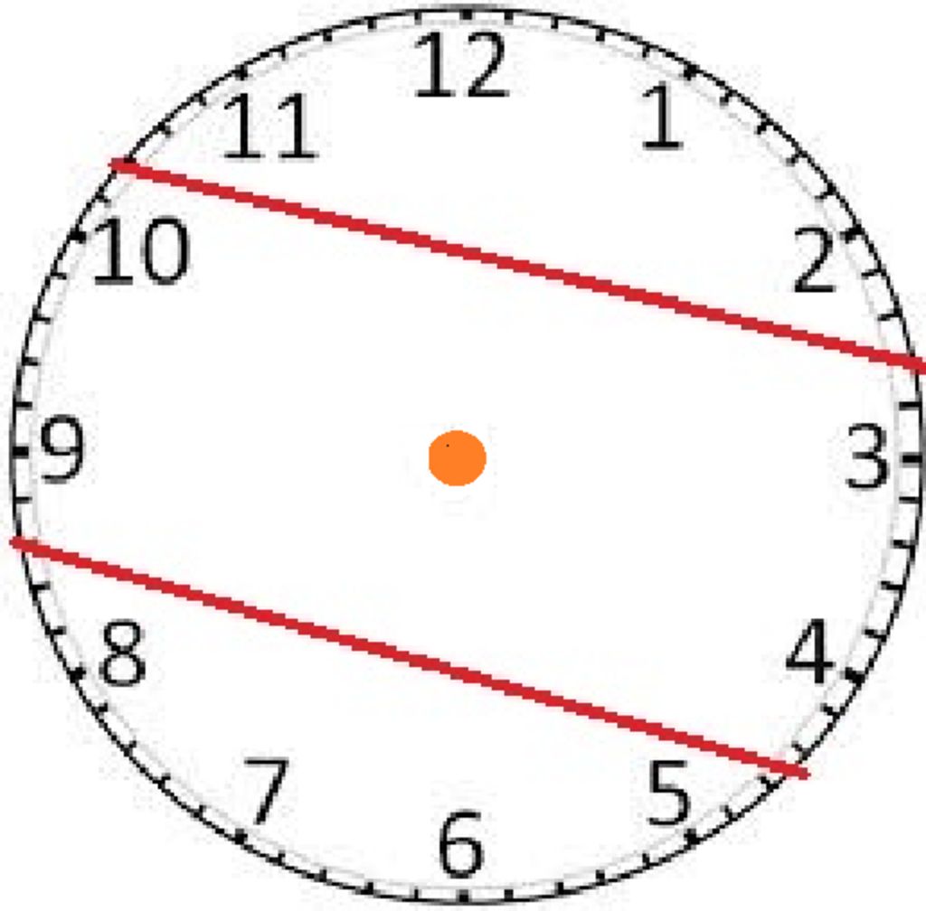Để chia đồng hồ làm ba phần bằng nhau , đồng nghĩa với việc chia sao cho các số trên đồng hồ cũng bằng nhau và buộc 2 đường thẳng đó phải song song với tâm của hình tròn :