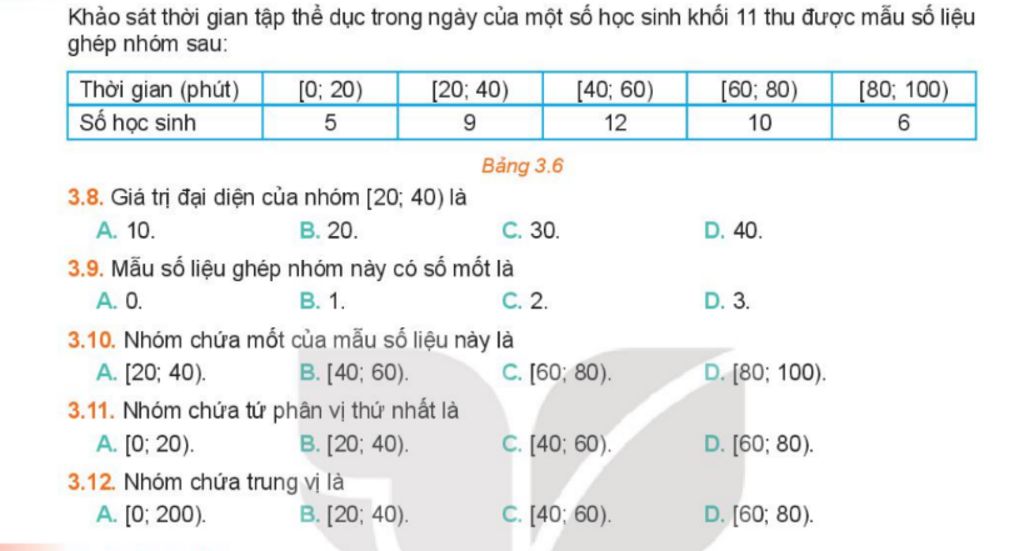 3.10 Tần số của nhóm [40;60) lớn nhất (=12) nên mốt thuộc nhóm [40;60)