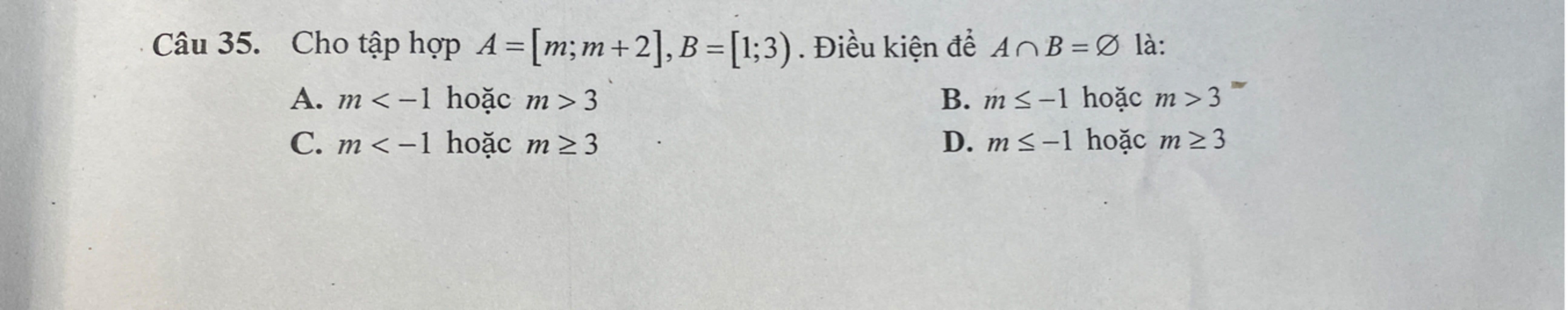 Cho tập hợp A[ m;m+2],B[1,3) Điều kiện để A giao B bằng tập hợp rỗng