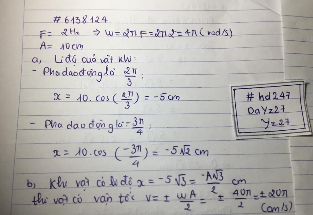 b) Khi vật có li độ x=-5 căn 3(cm) thì vận tốc, gia tốc bằng bao nhiêu