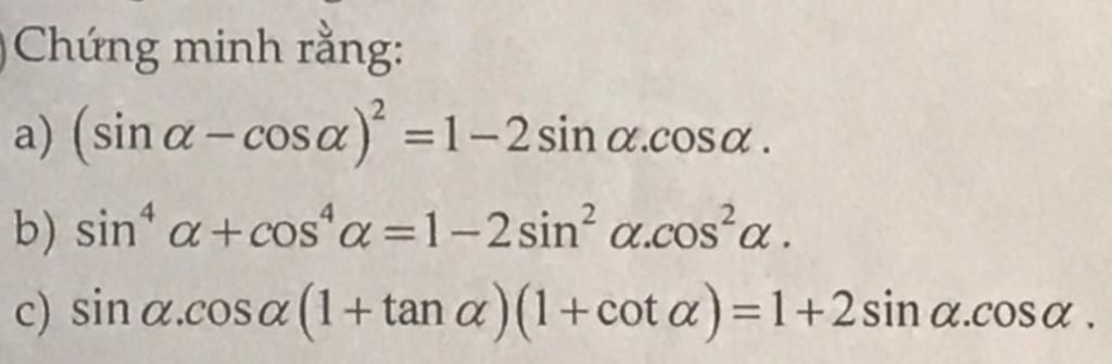 `b. sin^4 \alpha + cos^4 \alpha = (sin^2 \alpha + cos^2 \alpha)^2 - 2sin^2 \alpha.cos^2 \alpha = 1-2sin^2 \alpha.cos^2 \alpha`