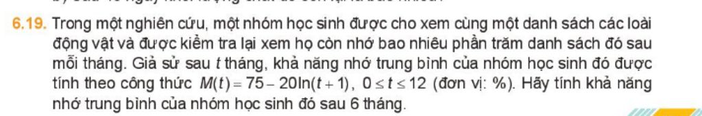 6.19. Trong một nghiên cứu, một nhóm học sinh được cho xem cùng một danh sách các loài động vật và được kiểm tra lại xem họ còn nhớ bao nhiêu phần trăm danh sách đó sau mỗi tháng. Giả sử sau t tháng, khả năng nhớ trung bình của nhóm học sinh đó được tính theo công thức (đơn vị: %). Hãy tính khả năng nhớ trung bình của nhóm học sinh đó sau 6 tháng.