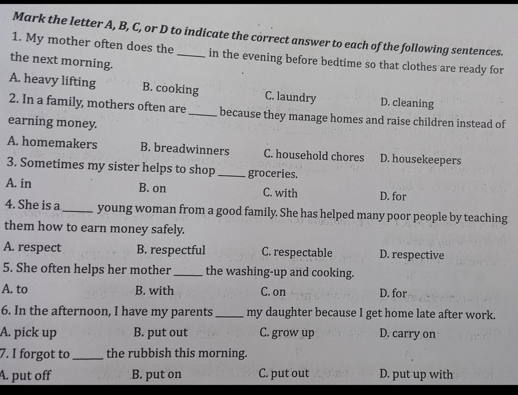 "Mẹ bạn thường giặt quần áo vào buổi tối trước khi đi ngủ để quần áo sẵn sàng cho sáng hôm sau."