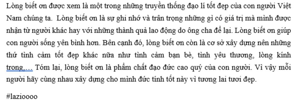 Biết ơn là đạo lý tốt đẹp của người Việt Nam ta được kế thừa và phát huy qua bao thế hệ. Biết ơn là việc ghi nhớ, trân trọng và tấm lòng tri ân công lao của người khác đã giúp đỡ, những người đã đóng góp công sức để mang đến cho chúng ta cuộc sống tốt đẹp. Lòng biết ơn giúp gắn kết con người với con người, phát huy được lối sống đẹp, nhân ái của dân tộc. Học sinh chúng ta cần biết trân trọng, biết ơn công lao nuôi dưỡng của cha mẹ, ông bà, biết tri ân công lai dạy dỗ của thầy cô, ghi nhớ công lao dựng và giữ nước của cha anh đi trước. Cùng với tấm lòng biết ơn chân thành, chúng ta cần thể hiện sự biết ơn ấy thông qua những hành động thiết thực: chăm sóc, hỏi thăm, giúp đỡ,... Với những hành động vô ơn, vong ơn bội nghĩa chúng ta cần phê phán, loại trừ. Người sống tình nghĩa, có lòng biết ơn sẽ được mọi người yêu quý, trân trọng, ngược lại nếu không có lòng biết ơn, chúng ta sẽ trở thành những kẻ ích kỉ, sống vô ơn, những mối quan hệ xã hội vì vậy cũng bị rạn nứt. Chúng ta hãy sống tình nghĩa, biết ơn và trân trọng những thành quả, những con người đã mang đến cho chúng ta cuộc sống tốt đẹp như hiện nay.