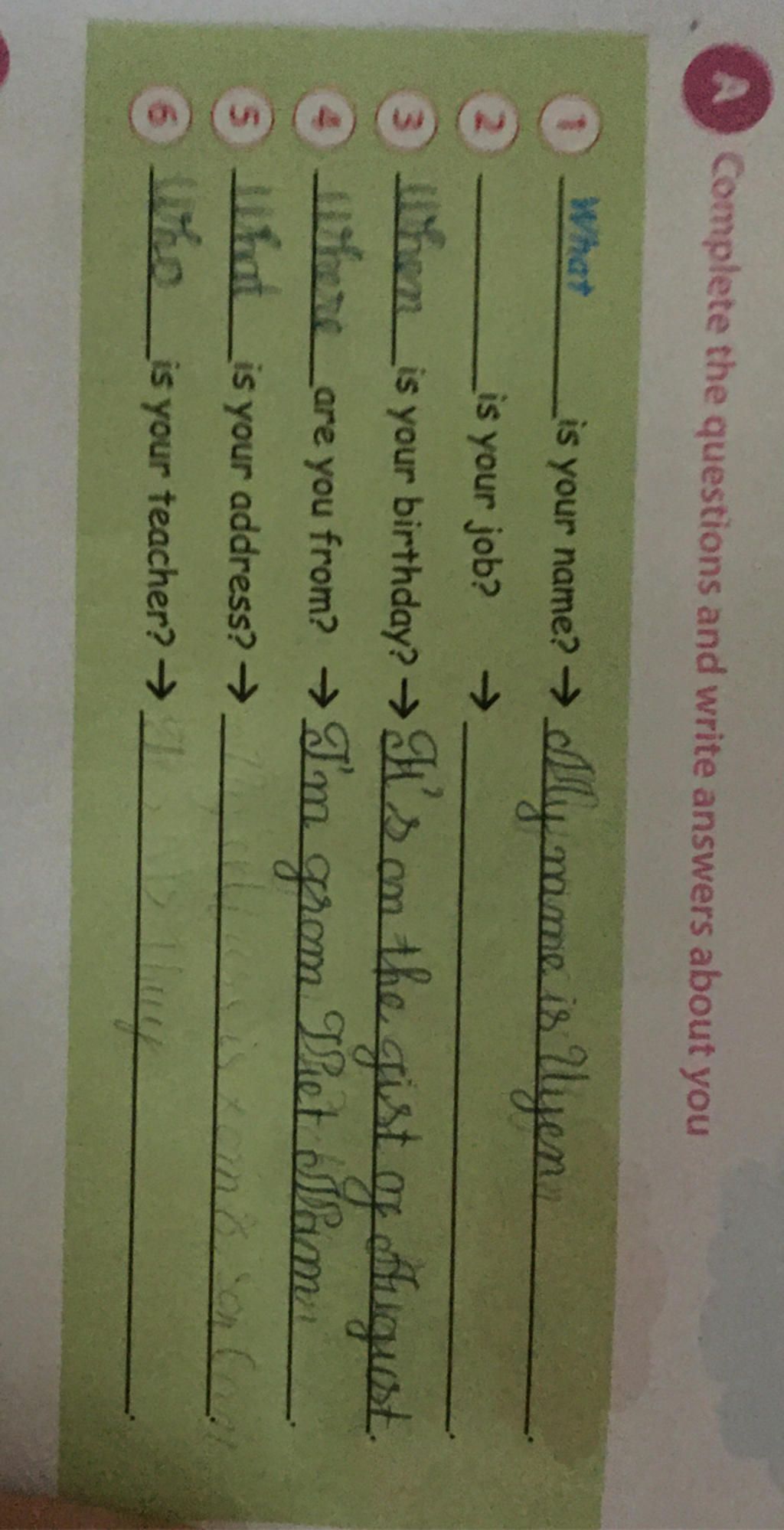 Who is your teacher(cô của bạn là ai)?→It's/My teacher is Mss/Mrs......(viết tên cô giáo)