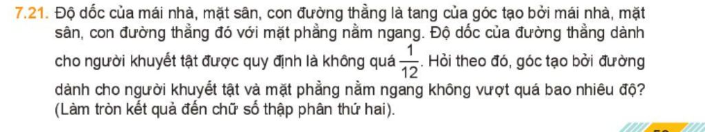 7.21. Độ dốc của mái nhà, mặt sân, con đường thẳng là tang của góc tạo bởi mái nhà, mặt sân, con đường thẳng đó với mặt phẳng nằm ngang. Độ dốc của đường thẳng dành cho người khuyết tật được quy định là không quá tải. Hỏi theo đó, góc tạo bởi đường dành cho người khuyết tật và mặt phẳng nằm ngang không vượt quá bao nhiêu độ?