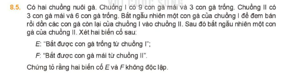 8.5. Có hai chuồng nuôi gà. Chuồng I có 9 con gà mái và 3 con gà trống. Chuồng II có 3 con gà mái và 6 con gà trống. Bắt ngẫu nhiên một con gà của chuồng I để đem bán rồi dồn các con gà còn lại của chuồng I vào chuồng II. Sau đó bắt ngẫu nhiên một con gà của chuồng II. Xét hai biến cố sau.