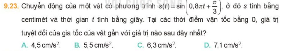 9.23. Chuyển động của một vật có phương trình s(t) = sin 0,8rt +3 ở đó s tinh bằng centimét và thời gian t tính bằng giây. Tại các thời điểm vận tốc bằng 0, giá trị3. tuyệt đối của gia tốc của vật gần với giá trị nào sau đây nhất?