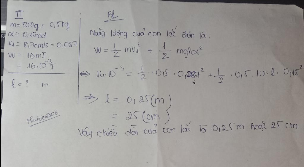 một con lắc đơn có chiều dài l , quả nặng khối lượng m= 500g. kéo con lắc lệch về bên trái so với phương thẳng đứng góc α1 = 0.15 rad, rồi truyền vận tốc v1 = 8.7 cm/s. khi đó người ta thấy con lắc dao động với năng lượng bằng 16(mJ). chiều dài con lắc là? ( cần gấp trong sáng nay )