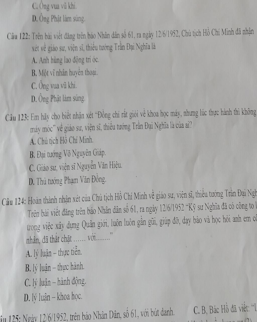 Câu 122: Trên bài viết đăng trên báo Nhân dân số 61, ra ngày 12/6/1952, Chủ tịch Hồ Chí Minh đã nhận