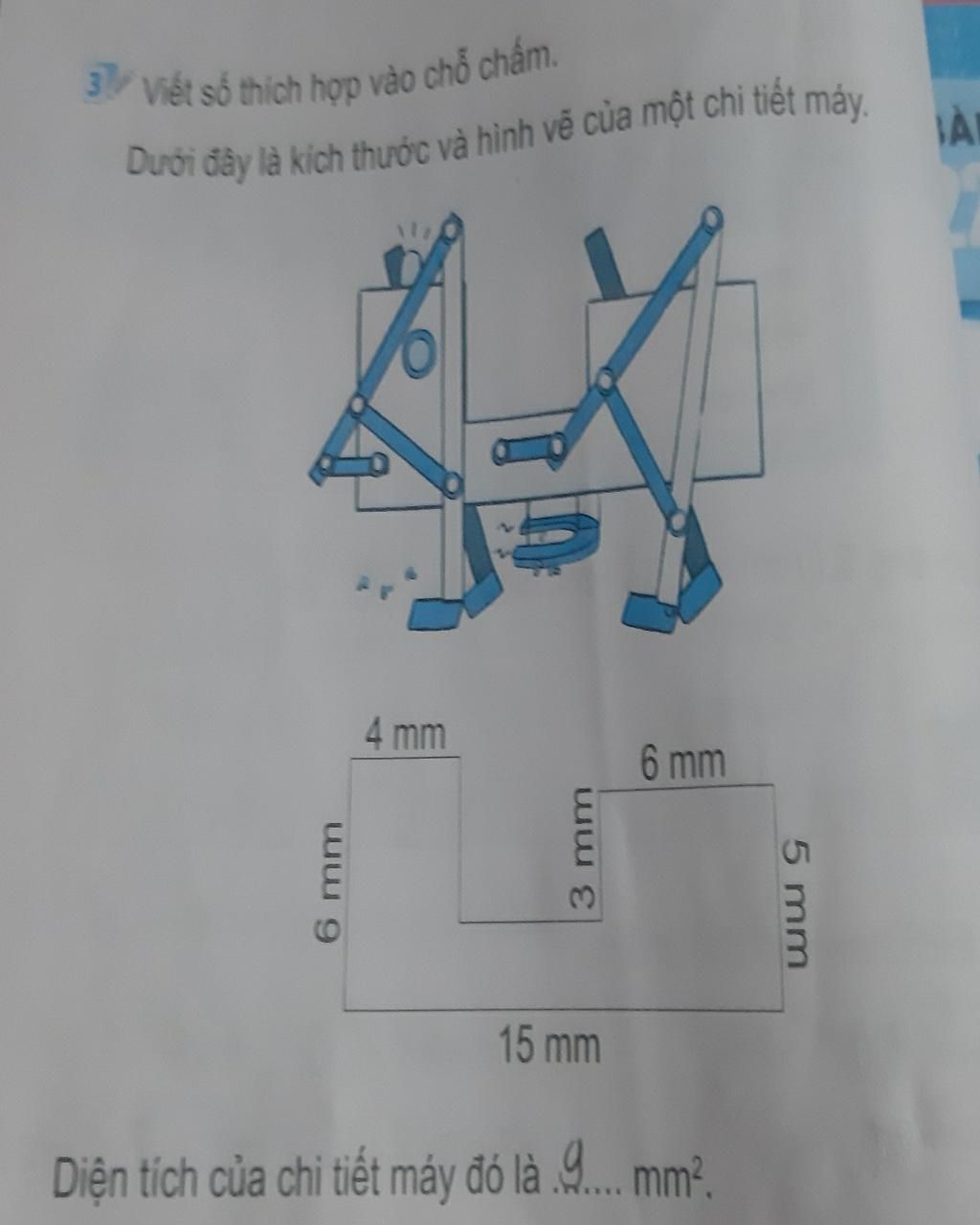 Dưới đây là kích thước và hình vẽ của một chi tiết máy. Hãy tính diện tích của chi tiết máy đó.