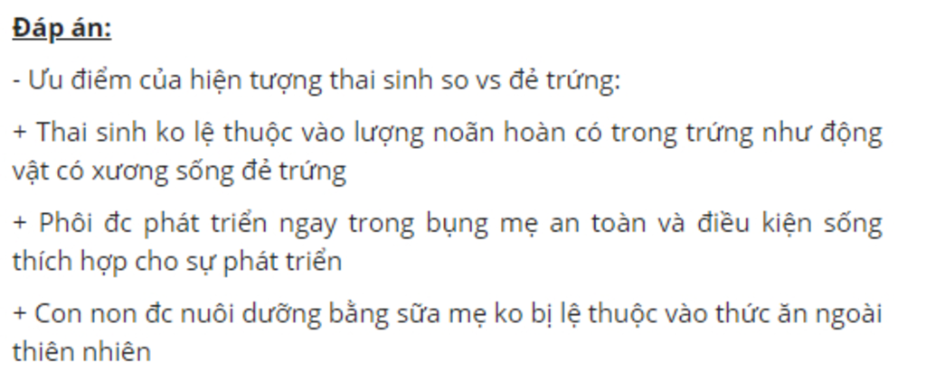 - Ưu điểm của sự thai sinh so với sự đẻ trứng và noãn thai sinh là:
