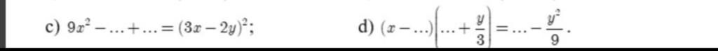 `d) (x-...)(...+y/3)= ... - (y^2)/9`