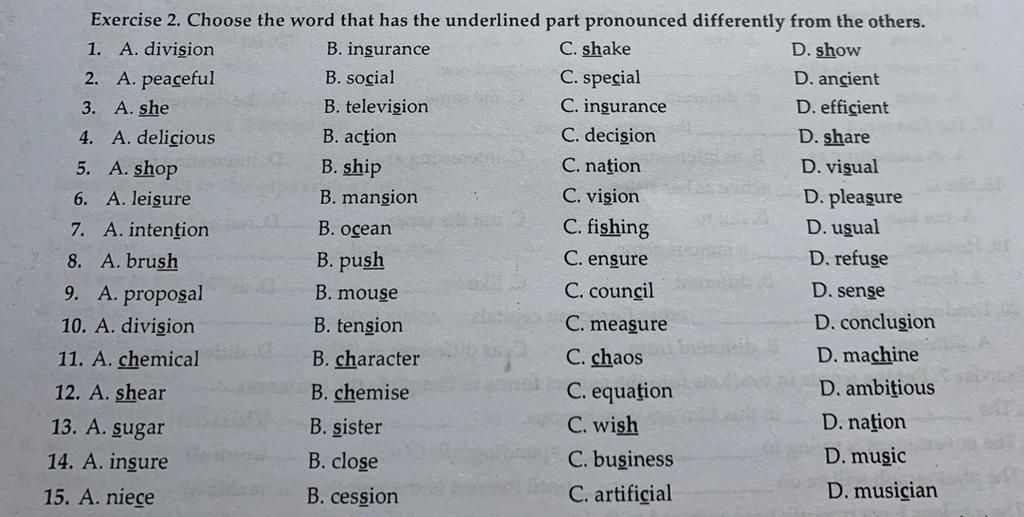 12. C ( câu c âm /ʒ/ còn lại là âm /ʃ/ )
