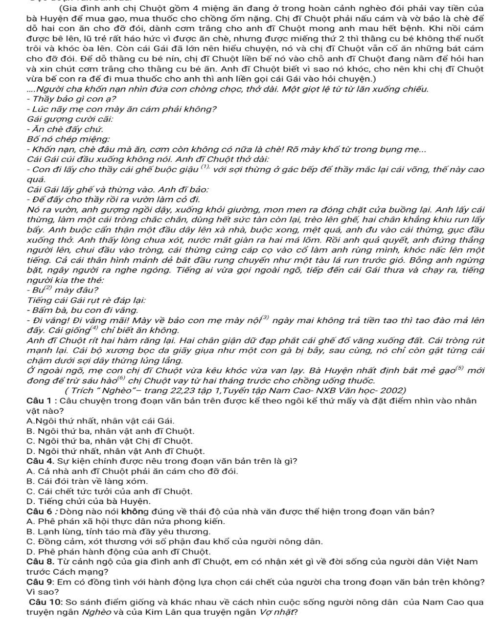 bà Huyện để mua gạo, mua thuốc cho chồng ốm nặng. Chị đĩ Chuột phải nấu cảm và vờ bảo là chè để