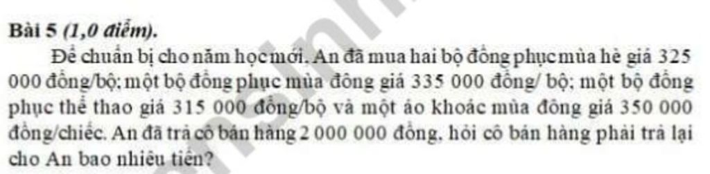 Tổng số tiền An mua 2 bộ đồng phục mùa hè , 1 bộ đồng phục màu đông , 1 bộ đồng phục thể thao , 1 áo khoác mùa đông là :