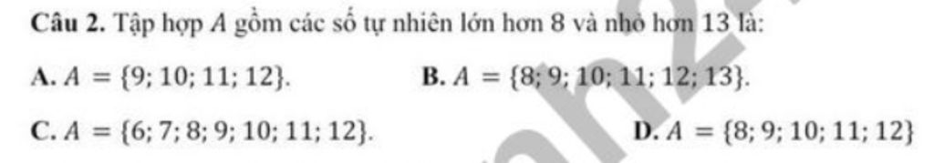 Câu 2. Tập hợp A gồm các số tự nhiên lớn hơn 8 và nhỏ hơn 13 là: