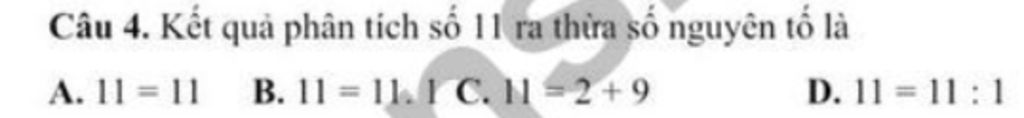 Câu 4. Kết quả phân tích số 11 ra thừa số nguyên tố là