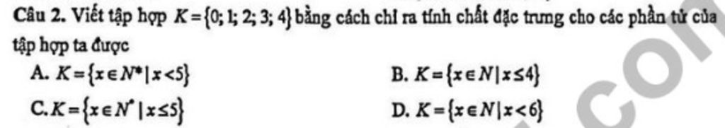 Câu 2. Viết tập hợp K={0; 1; 2; 3; 4} bằng cách chỉ ra tính chất đặc trưng cho các phần tử của tập hợp ta được: