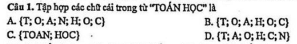 `->` Tập hợp các chữ cái trong từ "TOÁN HỌC" là: { T; O; A; N; H; C }