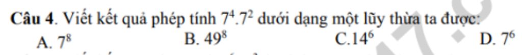 Ta có: $7^4\cdot 7^2=7^{4+2}=7^6$