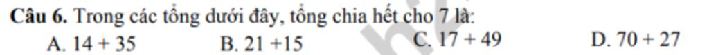 Câu 6. Trong các tổng dưới đây, tổng chia hết cho 7 là: