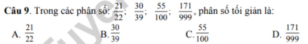 `A. 21/22->` Là phân số tối giản `->` Nhận