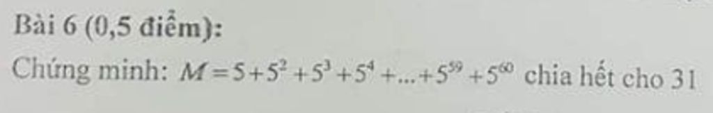 $M=(5+5^2+5^3)+\dots+(5^{58}+5^{59}+5^{60})\\ =5(1+5+5^2)+\dots+5^{58}(1+5+5^2)\\ =(5+\dots+5^{58})(1+5+5^2)\\ =(5+\dots+5^{58}).31\ \vdots \ 31$