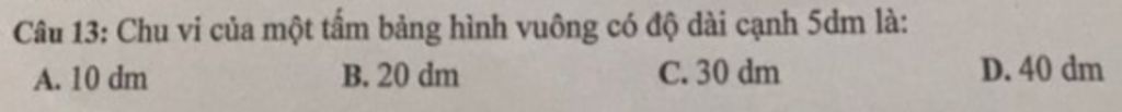 Chu vi của một tấm bảng hình vuông có độ dài cạnh $5dm$ là: