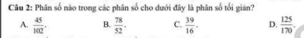 Đáp án `D` chưa tối giản là do cả tử và mẫu đều có thể chia hết cho `5