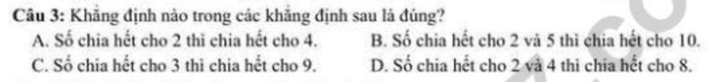 `D->` Câu này sai `.` Vd `36 vdots;36vdots4` nhưng `36` không chia hết cho `8`