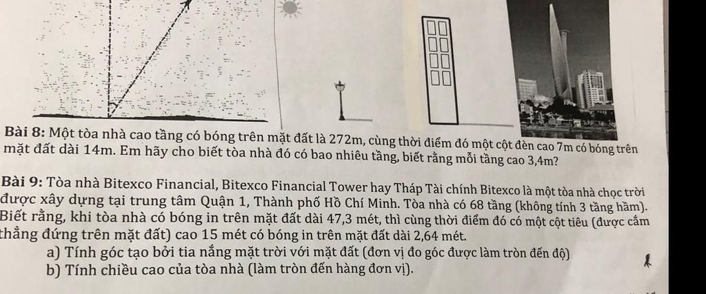 Bài 8: Một tòa nhà cao tầng có bóng trên mặt đất là 272m, cùng thời điểm đó một cột đèn cao 7m có bóng trên