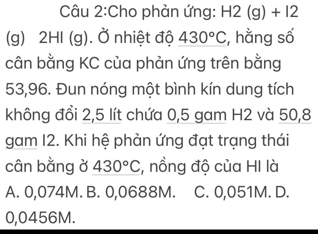 Ta có $:K_C=\dfrac{[HI]^2}{[H_2].[I_2]}=53,96\\ \to\dfrac{(2x)^2}{(0,1-x).(0,08-x)}=53,96\\ \to \left[\begin{matrix} x=0,1256(l)\\ x=0,0688\end{matrix}\right.$