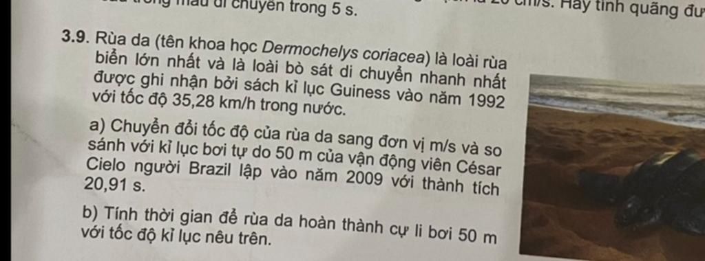 b) Thời gian để rùa da hoàn thành cự ly bới 50m với kỉ lục nêu trên là: `t = s/v = 50/(9,8) ~~ 5,1` (s)