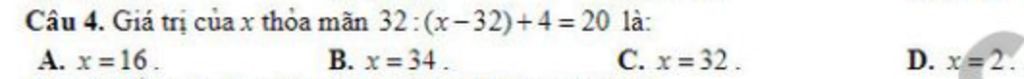 $32:(x-32)+4=20\\ \to 32:(x-32)=20-4\\ \to 32:(x-32)=16\\ \to x-32=32:16\\ \to x-32=2\\ \to x=32+2\\ \to x=34.$