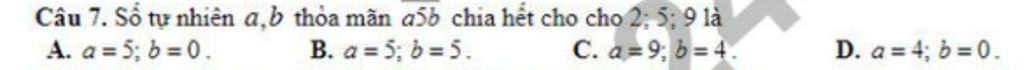 Để `overline{a5b} vdots` cho `2;5` thì chữ số tận cùng là `0`