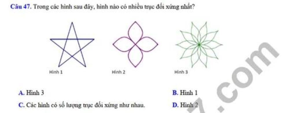 `=>` Hình `3` có nhiều trục đối xứng nhất