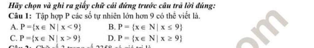 Tập hợp $P$ các số tự nhiên lớn hơn $9$ có thể viết là: