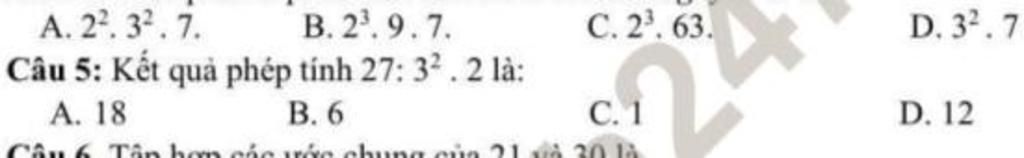 Câu 5 : Kết quả của phép tính `27 ÷ 3^2 * 2` là :