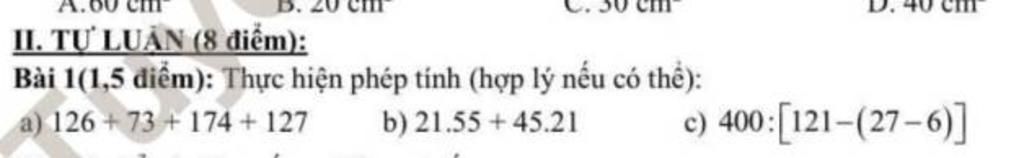 $a) 126 +73 + 174 + 127\\ =(126 + 174)+(73 + 127)\\ =300+200\\ =500\\ b) 21.55 + 45.21\\ = 21(55 + 45)\\ = 21.100\\ = 2100\\ c) 400 : [121-(27-6)]\\ =400 : [121-21]\\ =400 : 100\\ =4.$