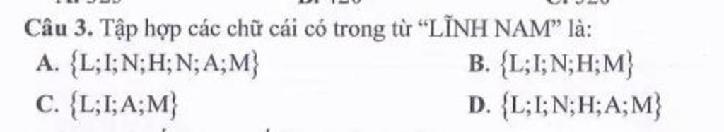 Tập hợp `A` các chữ cái có trong từ "LĨNH NAM" là: