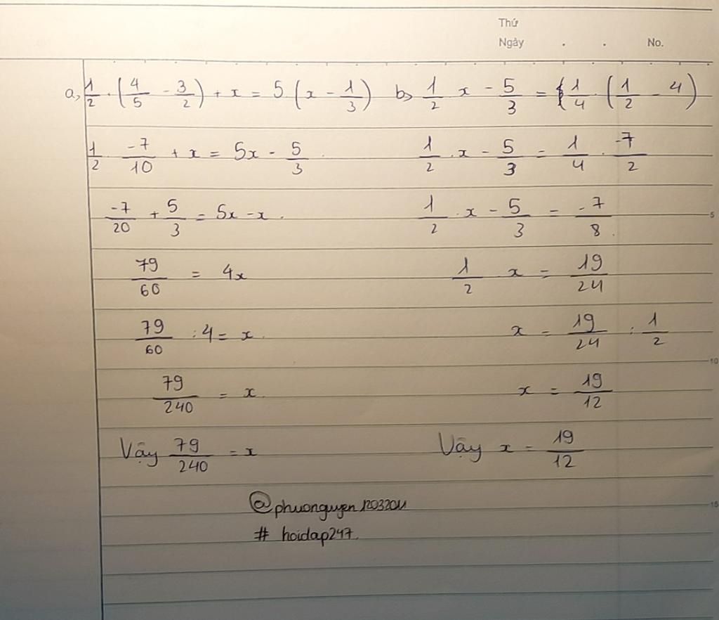 `1/2 * (4/5 - 3/2) + x = 5(x - 1/3)`
