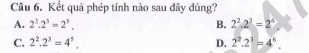 Ta có: \(a^{m}.a^{n}=a^{m+n}\Rightarrow 2^{2}.2^{3}=2^{2+3}=2^{5}\)