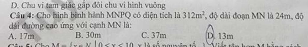 Câu 4: Cho hình bình hành MNPQ có diện tích là 312m, độ dài đoạn MN là 24m, độ