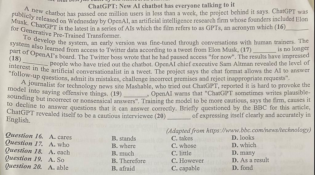 19. C. However (dịch câu: rất khó để khiến máy nói những thứ thô tục. Tuy nhiên, OpenAI cảnh cáo rằng"Chat GPT thi thoảng có đưa ra câu trả lời tường chừng như hợp lí nhưng thật ra thì vô lí hoặc là sai"